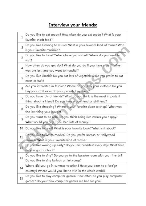 Web in pairs, students take it in turns to interview their partner by asking the get to know you questions on the worksheet and noting down the answers. Here is a list of questions and follow up questions that students can use as a base for interviewing each other. Web the following interview themes are included:back to school end of school yearfavorite thingshalloweenwinter breakmoviesgaminganimalsmy townfoods interview: