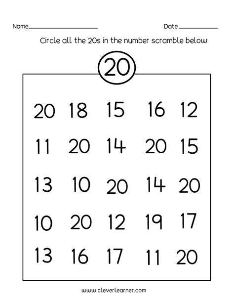 Number 20 writing, counting and identification printable worksheets for from cleverlearner.com