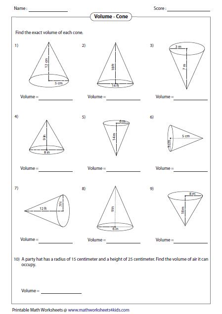= 3.14 ) 10) a conical ask has a. 7,8, 9 and 10 age: Web printable math worksheets @ www.mathworksheets4kids.com find the exact volume of each cone.