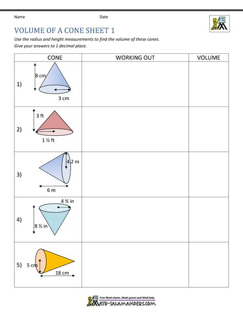 Web volume of a cone this page has a collection printable worksheets for teaching students to calculate the volume of a cone. You can select different variables to customize these surface area &. Web 1871 5 cm 14 ft volume =volume =volume = 4) 5) 6 m 6) in5 cm 491 c 3 8 in volume =volume =volume = 7) 8) 9) 8 m 712 ftin m98 6 in volume =volume =volume = 10) a.